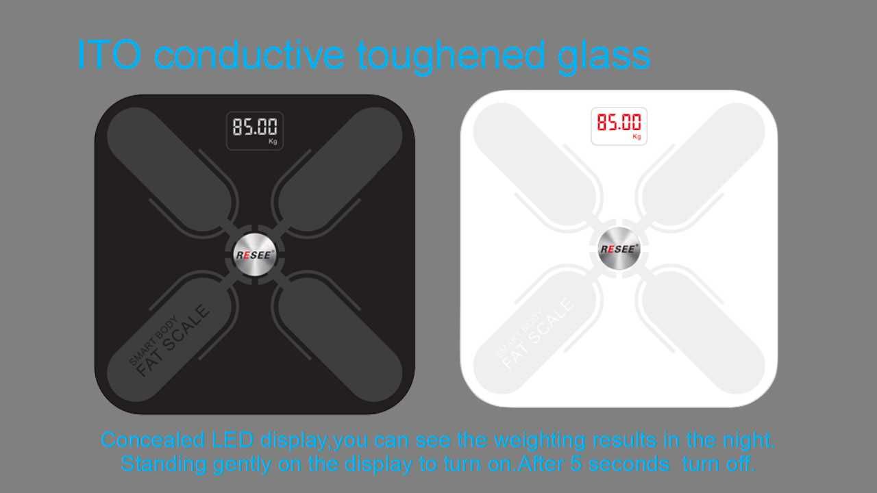 Surface Ground:Hard floor Wireless Mode:Bluetooth LE 4.2 Dimension:300*300*25mm Capacity:0.2~180KG (0.4~400lb) BIA technology:Dual Frequency Accuracy:50g (<100KG) 100g (100~180KG) Conductor:4 x ITO Surface:Ultra transparent toughened glass DisplayHeart Rate:LED Display for Weight Power:3*AAA Battery/Rechargeable lithium battery